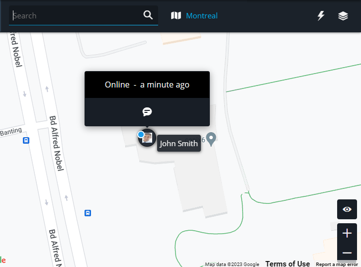 Haga clic en un marcador de usuario de Genetec Mobile para mostrar la siguiente información de usuario en un panel lateral:
