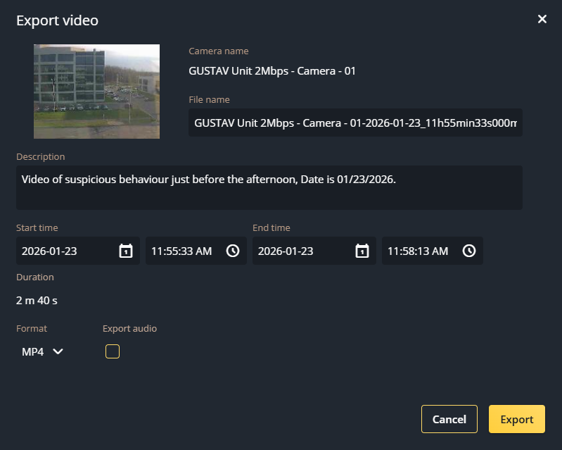 Pour lire des fichiers vidéo en dehors de Genetec Web App, vous devez exporter la vidéo d'une tuile vers votre disque dur local.